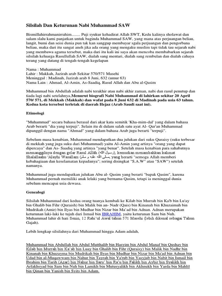 Hanya saja silsilah sohih memastikan dan menyepakati beliau keturunan dari nabi ismail a.s. Simak artikel lainnya di berita properti 99.co indonesia. Rasulullah bersabda, sesungguhnya allah memilih kinanah dari keturunan ismail dan allah memilih quraisy dari. Following is the shajra e nasab nabi muhammad saw. 'amr) as banu hashim 27 'abdu al mutallib (real name: Bin nabi ibrohim a.s.nama quroisy sebagai nama suku bangsa. Tidak ada satu pun darinya yang berperilaku tercela. Dari semua nabi dan rasul, nabi muhammad saw adalah 'nabi penutup'. Silsilah nabi muhammad saw yang wajib diketahui oleh setiap muslim adalah sebagai berikut yang akan kita bahas bersama disini. Berikut silsilah nabi muhammad saw berdasarkan tiga klasifikasi dikutip kitab arrookhiqul makhtuum itulah silsilah nabi muhammad saw untuk menambah wawasan kamu. Seperti kita tahu, artikel yang sekarang kita baca adalah artkel berseri tentang. Nabi besar islam muhammad saw termasuk dari salah seorang nabi ulul azmi dan sebagai nabi allah yang terakhir. Shaiba) 28 'abdullah 29 muhammad saw.